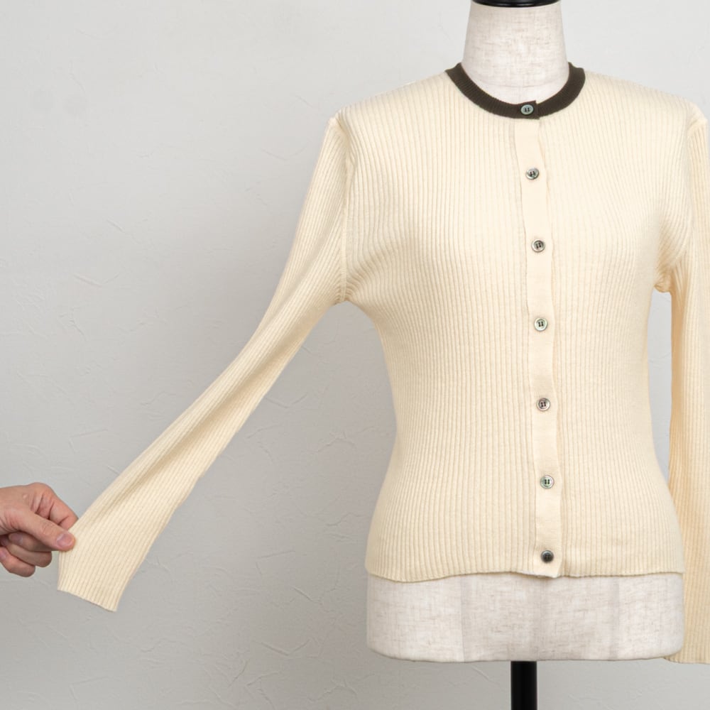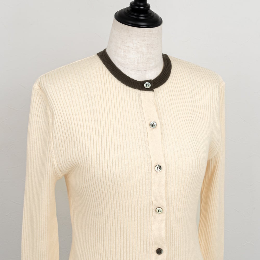襟の配色がアクセント、タイトなシルエットのリブ編みカーディガン。