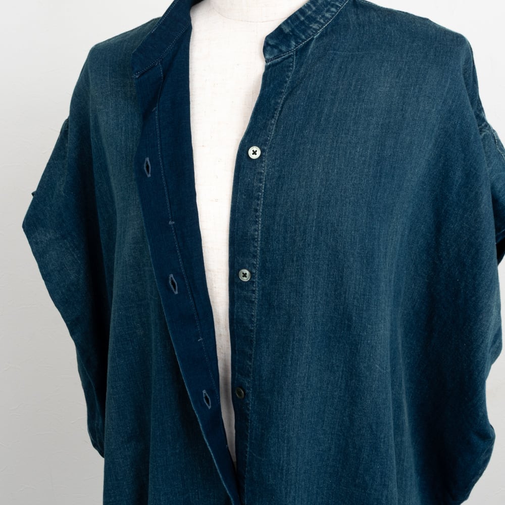 小さめのスタンドカラーに程よいスキッパーネックと比翼仕立てですっきりと。